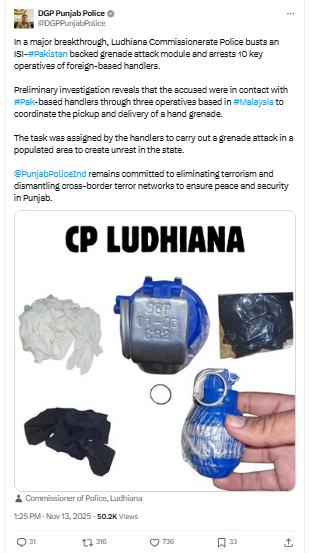 पंजाब पुलिस के डीजीपी गौरव यादव ने बताया कि लुधियाना कमिश्नरेट पुलिस ने इस मॉड्यूल को ध्वस्त किया है। उन्होंने कहा कि यह मॉड्यूल आईएसआई और पाकिस्तान समर्थित नेटवर्क से जुड़ा हुआ था और पंजाब में शांति भंग करने की साजिश रच रहा था।