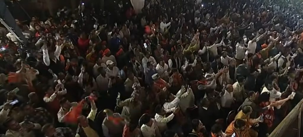 बीजेपी मुख्यालय में आयोजित जश्न समारोह में प्रधानमंत्री नरेंद्र मोदी ने इस ऐतिहासिक जीत पर जनता को संबोधित किया। उन्होंने अपने भाषण की शुरुआत “जय छठी मैया” के उद्घोष से की और कहा कि बिहार के लोगों ने “गर्दा उड़ा दिया है।” यह वाक्यांश बिहार की बोली का हिस्सा है और इसे उन्होंने जनता के उत्साह और विश्वास का प्रतीक बताया। मोदी ने कहा कि यह जीत केवल एनडीए की नहीं, बल्कि लोकतंत्र की विजय है।