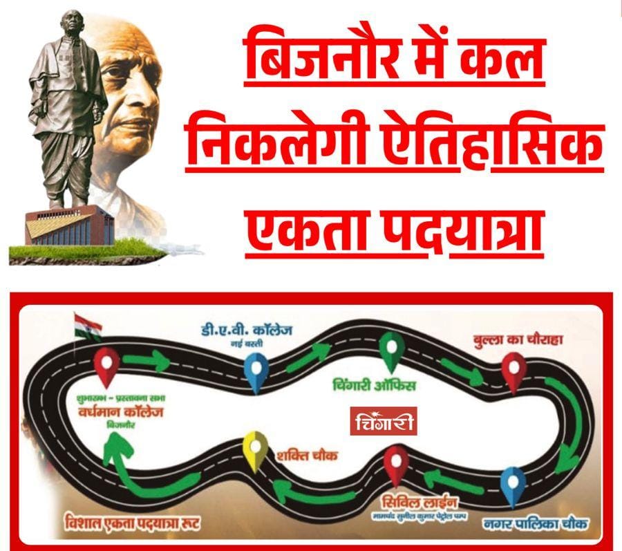 लौह पुरुष सरदार वल्लभभाई पटेल जी की 150वीं जयंती के उपलक्ष्य में बिजनौर में एक भव्य एकता पदयात्रा का आयोजन किया जा रहा है। इस ऐतिहासिक कार्यक्रम का नेतृत्व सदर विधायक सूची मौसम चौधरी एवं भारतीय जनता पार्टी के वरिष्ठ नेता ऐश्वर्या मौसम चौधरी करेंगे।