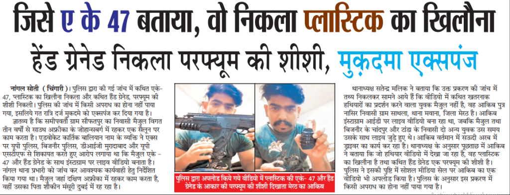 मेरठ जनपद के नूरपुर सोती क्षेत्र में एक वीडियो वायरल होने के बाद पुलिस प्रशासन में हलचल मच गई। वीडियो में एक युवक को एके-47 जैसी दिखने वाली बंदूक और हैंड ग्रेनेड जैसा एक वस्तु हाथ में लिए देखा गया। सोशल मीडिया पर इस वीडियो के प्रसार के बाद लोगों में भय का माहौल बन गया और पुलिस ने इसे गंभीरता से लेते हुए तत्काल जांच शुरू की।