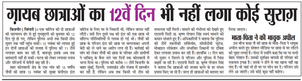 (बिजनौर)। दो छात्राएं 15 नवंबर को कॉलेज के लिए घर से निकली थीं, लेकिन आज तक वापस नहीं लौटीं। घटना को 12 दिन बीत चुके हैं, लेकिन पुलिस को अब तक कोई ठोस सुराग नहीं मिला है। परिजनों की चिंता बढ़ती जा रही है और प्रशासन पर सवाल उठ रहे हैं।