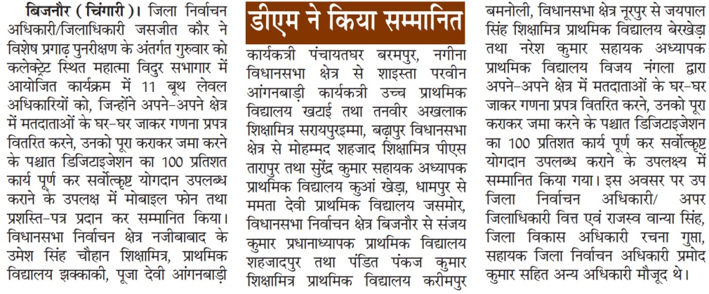 बिजनौर – जिन्होंने पूरा किया SIR का 100 प्रतिशत काम उन 11 बी.एल.ओ को मिला इनाम