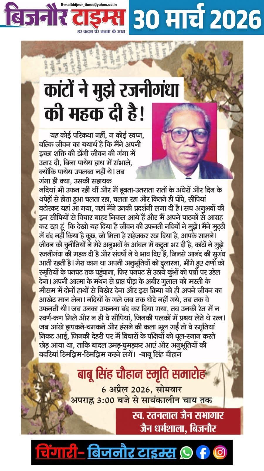 परम आदरणीय बाबू सिंह चौहान ( बाबू जी ) के लेखों निबंधों में इसी सत्य के दर्शन होते हैं ।